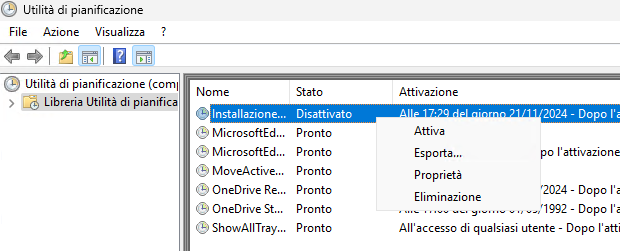 Una volta installati i programmi di proprio interesse con Winget, lo script PowerShell provvede a disattivare l’operazione pianificata. Volendo, è possibile eliminarla digitando Utilità di pianificazione, cliccando su Libreria Utilità di pianificazione quindi rimuovendo l’attività InstallazionePacchetti nel riquadro di destra (tasto destro Eliminazione).