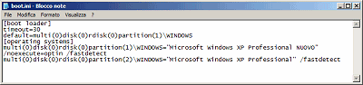 L’installazione di Windows XP creerà (nella prima partizione) un file nascosto denominato boot.ini: permetterà la comparsa del menù di scelta del sistema operativo da avviare all’accensione del pc.
