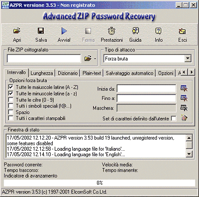 Advanced Zip Password Recovery (abbreviato AZPR; prelevabile da questa pagina) è, invece, la Ferrari tra i software della sua categoria. Sviluppato da Elcomsoft, azienda specializzata nel recupero password di qualunque genere, è un programma commerciale (la registrazione costa 30 Dollari per uso personale), distribuito comunque anche in versione dimostrativa, limitata nelle sue funzionalità.