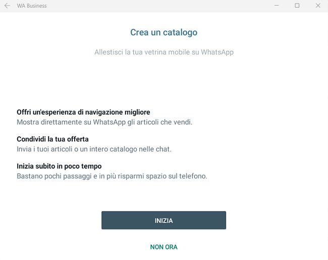 WhatsApp Business chiede innanzi tutto di inserire i propri dati e offre l’opportunità di creare un catalogo di prodotti e servizi per la propria attività.