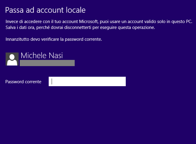 Per continuare, si dovrà cliccare su Il tuo account, Disconnetti quindi digitare – per conferma – la password associata all’account Microsoft: