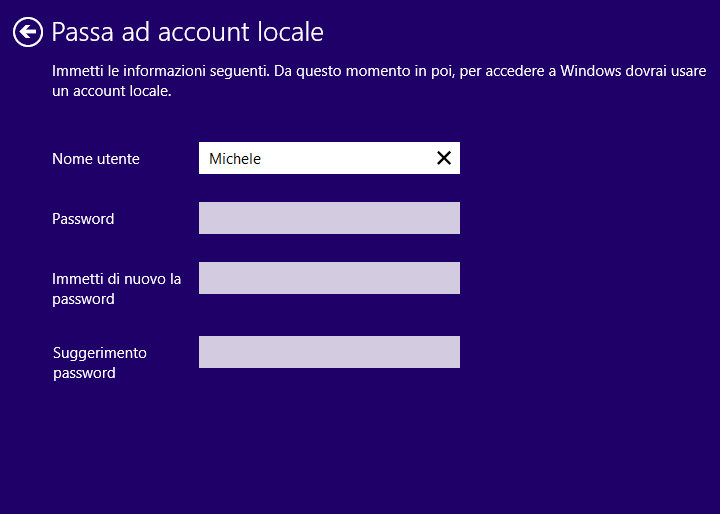 A questo punto si potranno impostare i dati dell’account locale da utilizzare in Windows 8.1.
