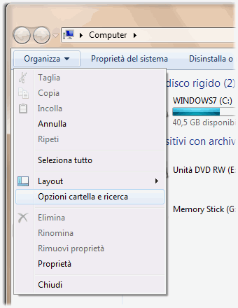Per richiedere la visualizzazione delle caselle nell’interfaccia di Windows, è sufficiente accedere alla finestra Computer, cliccare sul menù Organizza quindi sulla voce Opzioni cartella e ricerca.
