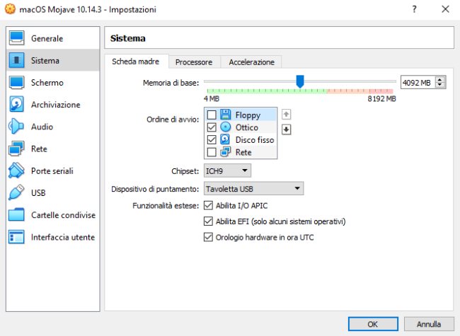 – Dalla colonna di sinistra si deve selezionare Sistema quindi assegnare almeno 4092 MB di RAM alla macchina virtuale macOS Mojave. Assicurarsi che il sistema disponga di un quantitativo di memoria RAM libero sufficiente (togliere la spunta da Floppy).