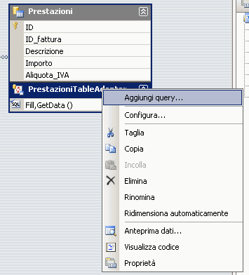 Clicchiamo con il tasto destro del mouse su PrestazioniTableAdapter quindi sulla voce Aggiungi query.