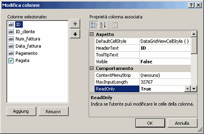 Facciamo clic sul pulsante a forma di freccia collocato in alto a destra nel “DataGridView” che elenca le fatture e che abbiamo inserito nel form frmFatture nel corso della precedente puntata. Scegliamo quindi la voce Modifica colonne. Accertiamoci di aver selezionato il campo denominato “ID” (l’identificativo numerico assegnato automaticamente a ciascuna fattura e memorizzato nel database) quindi variamone la proprietà “(Name)” in IDFattura.