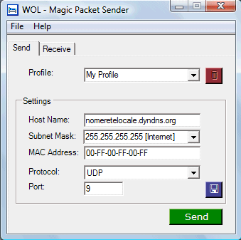 Dopo aver installato ed eseguito il programma sul terminale remoto, è sufficiente indicare (Host Name) l’IP del router o l’indirizzo mnemonico associato (DynDNS), selezionare Internet da Subnet Mask, il MAC Address del sistema “da risvegliare”.