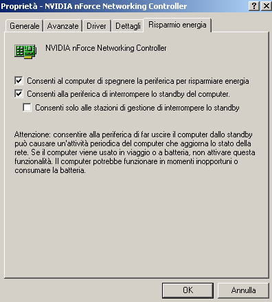 Dalla sezione Schede di rete, è necessario fare doppio clic sulla denominazione corrispondente alla scheda installata sul personal computer. All’interno della scheda Risparmio energia, va attivata la casella Consenti alla periferica di interrompere lo standby del computer.