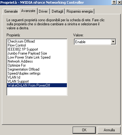 Nella scheda Avanzate, bisogna invece verificare che la voce WakeOnLAN from PowerOff oppure Wake from Shutdown sia abilitata (Enable).