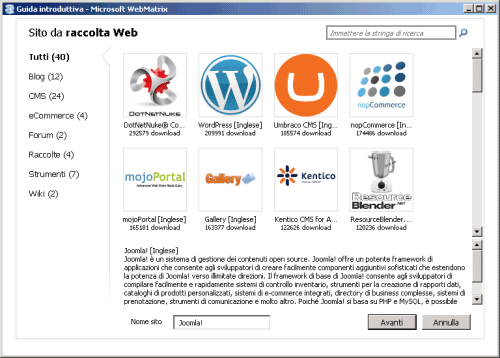 Il secondo pulsante (“Sito da raccolta web“) consente di accedere ad una “galleria” di applicazioni web, alcune delle quali ampiamente conosciute (citiamo, ad esempio, Joomla, WordPress, DotNetNuke, SugarCRM, phpBB e Drupal) che sono state sviluppate utilizzando linguaggi differenti tra i quali ASP.NET e PHP. WebMatrix è in grado di sovrintendere l’intero processo di download, installazione e configurazione delle varie applicazioni web opensource.