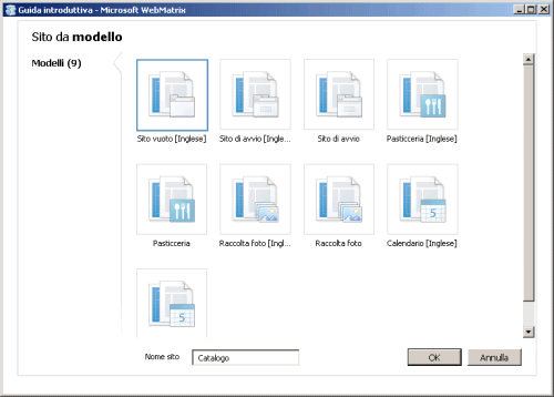 Per iniziare subito a programmare e saggiare i vantaggi derivanti dall’impiego di WebMatrix, suggeriamo di cliccare sul pulsante Sito da modello, selezionare Sito vuoto ed assegnare, ad esempio, il nome Catalogo al progetto (campo Nome sito).