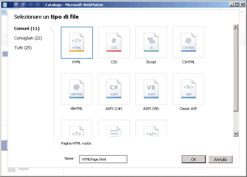 Il pulsante File consente di aggiungere o di creare rapidamente file che andranno a comporre il proprio progetto ossia l’applicazione web che si sta sviluppando. Dopo aver scelto File, ci si troverà dinanzi ad una schermata simile alla seguente: