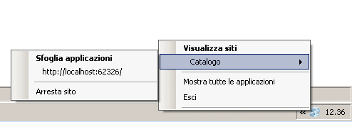 Cliccando con il tasto destro del mouse sull’icona esposta nell’area della traybar di Windows (in basso a destra), è possibile verificare l’elenco dei siti web aperti in WebMatrix e raggiungibili invocando il corrispondente indirizzo locale.