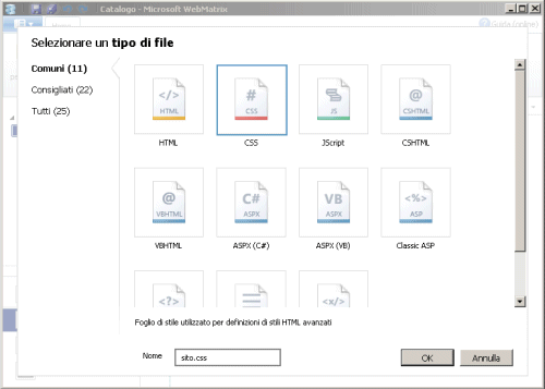 Utilizzando il pulsante Nuovo, selezionando CSS quindi impostando sito.css come nome del file (campo Nome), è possibile aggiungere al progetto un foglio di stile: