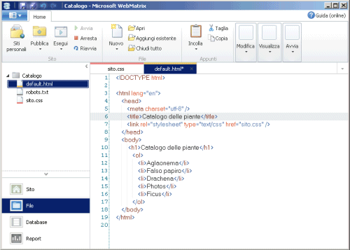 Cogliamo l’occasione per inserire, nella tag <title> (titolo della pagina web) la frase “Catalogo delle piante“. Ad ogni modifica, si ricordi di salvare sia il file CSS che il file HTML utilizzando il piccolo pulsante Salva tutto posto nella barra del titolo della finestra di WebMatrix.