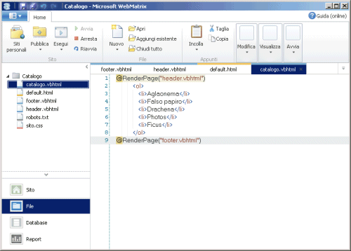 Utilizzando @RenderPage("nomedellapagina") è possibile richiedere l’inclusione del codice proveniente da un’altra pagina all’interno di quella ove si sta lavorando. Si torni sul file catalogo.vbhtml e si aggiungano le righe @RenderPage("header.vbhtml") e @RenderPage("footer.vbhtml"), rispettivamente, in testa ed in calce allo stesso: