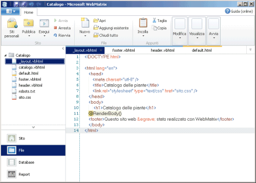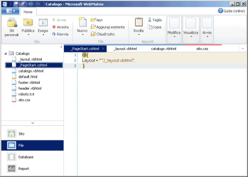 WebMatrix consente di muoversi tra diversi spazi di lavori, detti “workspaces“. Ciò si concretizza agendo, semplicemente, sui pulsanti posizionati nella colonna di sinistra del programma (Sito, File, Database e Report).