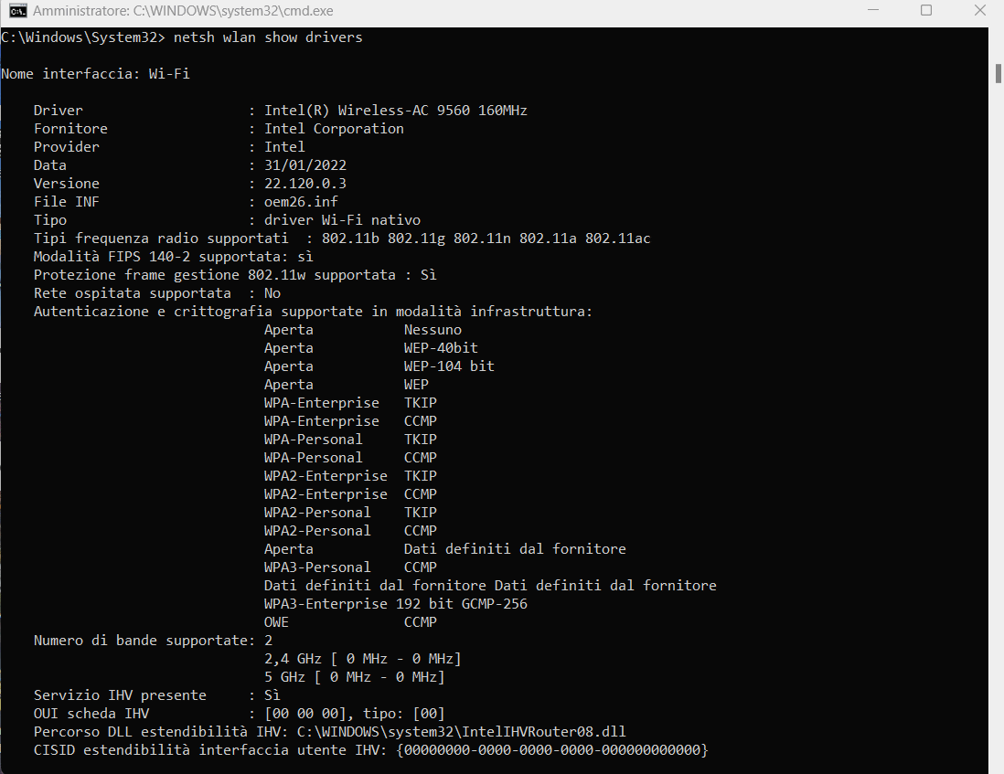 Il comando netsh wlan show drivers offre uno spaccato davvero interessante sulle potenzialità della scheda di rete. Oltre a conoscere il nome del driver della scheda wireless, che compare nella finestra Gestione dispositivi, Schede di rete, il comando restituisce le versioni del protocollo 802.11, le bande di frequenza (2,4, 5 e 6 GHz), i protocolli di autenticazione e crittografia supportati.
