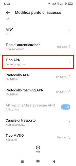 In corrispondenza di Tipo di accesso, dovrà essere indicato default,supl,dun altrimenti – nella maggioranza dei casi – ci si potrà collegare in modalità wireless al telefono ma non si potrà navigare in rete usando la connessione dati mobile (tethering).