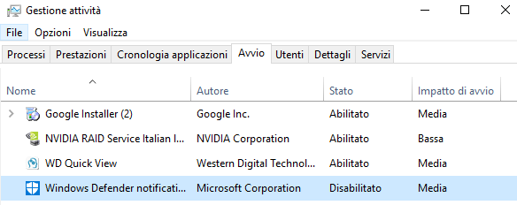 In corrispondenza di ogni applicazione, viene indicato l’impatto che ha il caricamento sul tempo di avvio di Windows 10.