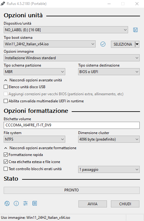 Scegliendo MBR in Tipo di schema partizione e BIOS o UEFI nel menu a tendina immediatamente accanto, si può creare una chiavetta USB avviabile, con Windows 11 24H2, compatibile con qualunque PC. Con un clic su AVVIA, si possono lasciare spuntate le varie caselle in maniera tale che sia Rufus a rimuovere automaticamente il controllo dei requisiti minimi.