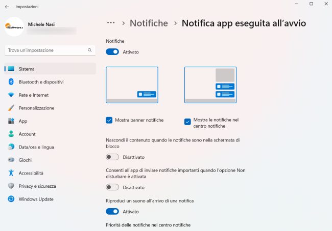 Cliccando sulla voce Notifiche da app e da altri mittenti si può modificare la notifica visualizzata nel momento in cui un programma si imposti in esecuzione automatica: per default viene mostrato un banner e un messaggio nel Centro notifiche. Si può anche intervenire sulla priorità della notifica, ad esempio in modo tale da mostrarla in alto nel Centro notifiche.