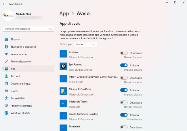 Digitando App di avvio nella casella di ricerca di Windows, vengono elencate le applicazioni in esecuzione automatica: i programmi che cioè vengono caricati a ogni ingresso in Windows 10 e 11.