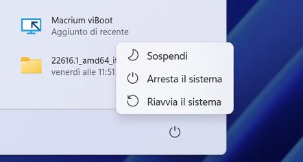 1) Cliccare sul pulsante Start di Windows 11 quindi sul pulsante Arresta in basso a destra. Tenere sempre premuto il tasto MAIUSC quindi cliccare sulla voce Riavvia il sistema.