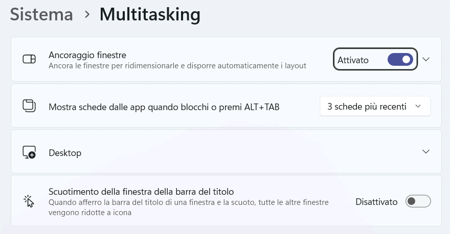 Digitando Multitasking nel campo di ricerca di Windows 11, è eventualmente possibile disattivare la funzione Snap layouts. È sufficiente agire sull’opzione Ancoraggio finestre.