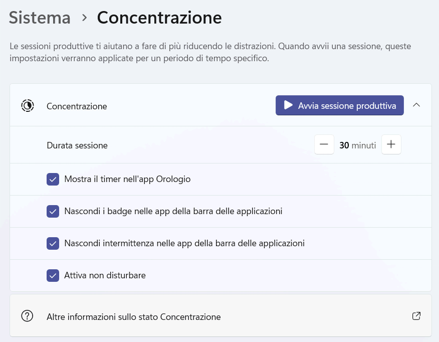Con un clic sul pulsante Avvia sessione produttiva, Windows 11 nasconde automaticamente tutte le informazioni superflue, evita il lampeggiare delle notifiche delle app sulla barra delle applicazioni e abilita la modalità Non disturbare. Il tempo dunque il quale si vogliono evitare distrazioni è fissato a 30 minuti per impostazione predefinita ma è possibile intervenire liberamente per modificarlo.