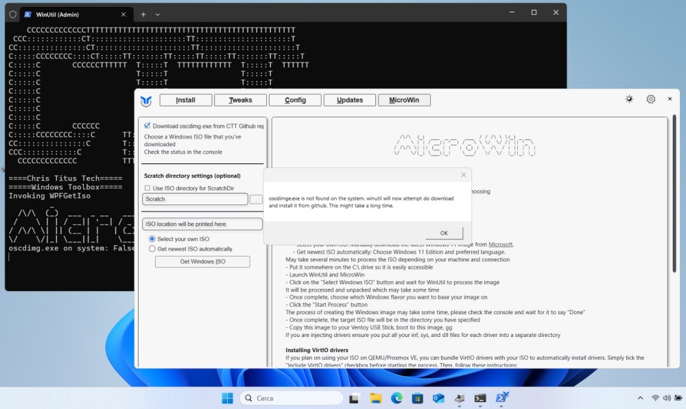 Alla comparsa del messaggio “oscdimage.exe is not found on the system“, cliccate semplicemente su OK: si tratta di un software che lo script provvede a scaricare autonomamente.
