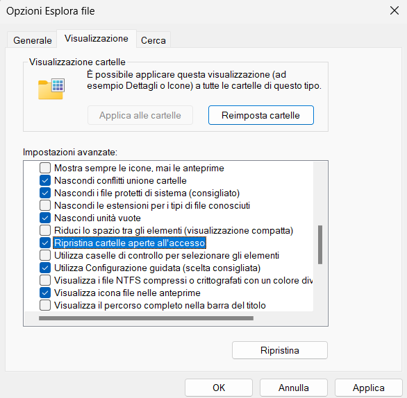 Selezionando la scheda Visualizzazione si deve scorrere l’elenco fino a trovare l’opzione Ripristina cartelle all’accesso e disattivare la casella corrispondente.