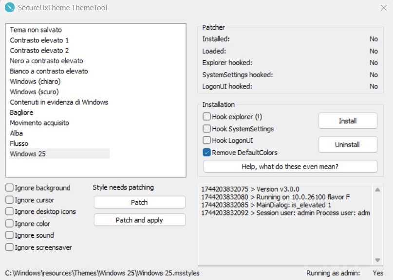 Riavviando ThemeTool.exe con i diritti di amministratore, si può finalmente cliccare su Windows 25 e poi il pulsante Patch and apply poco più in basso.