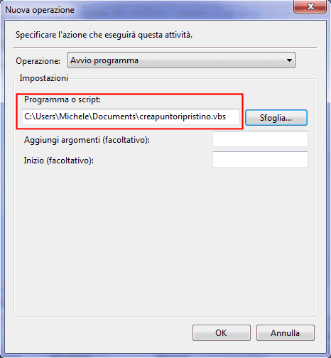 Tornando alla scheda Azioni, si dovrà cliccare sul pulsante Nuova, lasciare selezionata l’opzione Avvio programma, fare clic su Sfoglia quindi individuare il file VBS appena creato: