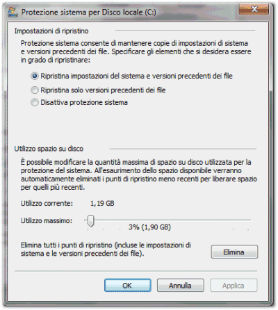 Per impostazione predefinita, su volumi di dimensioni superiori a 64 GB, lo spazio destinato alla memorizzazione dei punti di ripristino viene impostato al 5% del totale. Per partizioni di dimensioni più contenute lo spazio destinato viene impostato al 3% del quantitativo complessivo. Il valore può comunque essere regolato come meglio si crede: massima flessibilità, quindi, rispetto allo stesso Windows Vista.