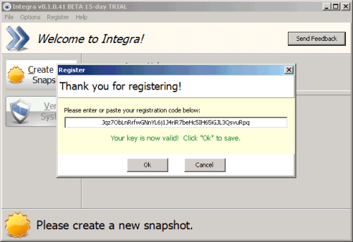 Non appena avviato per la prima volta, Integra – che può essere utilizzato senza la necessità di avviare alcuna procedura d’installazione – opererà in modalità trial, per un periodo massimo di 15 giorni. Utilizzando il codice di prova (Jqz7ObLnRrfwGNnYL6j1J4riR7beHc5IH65iGJL3QsvuRpq) pubblicato in questa pagina dagli stessi autori del programma, si potrà registrare il software ed usarlo per un periodo di tempo illimitato.