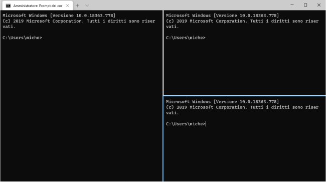 Premendo MAIUSC+ALT+D, scorciatoia personalizzabile intervenendo sulla riga { "command": { "action": "splitPane", "split": "auto", "splitMode": "duplicate" }, "keys": "alt+shift+d" } del file delle impostazioni in formato JSON, è possibile suddividere la riga di comando in due o più pannelli verticali e orizzontali.