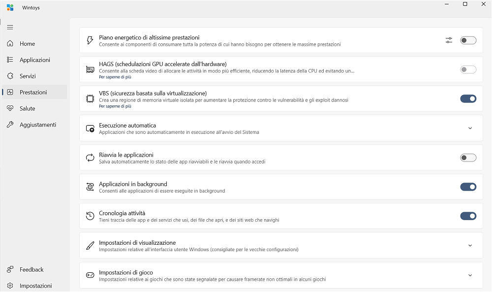 Con un clic su Prestazioni, Wintoys permette di accedere a una serie di regolazioni mirate a ottimizzare il funzionamento del computer, specialmente per migliorare la velocità e l’efficienza del sistema operativo.