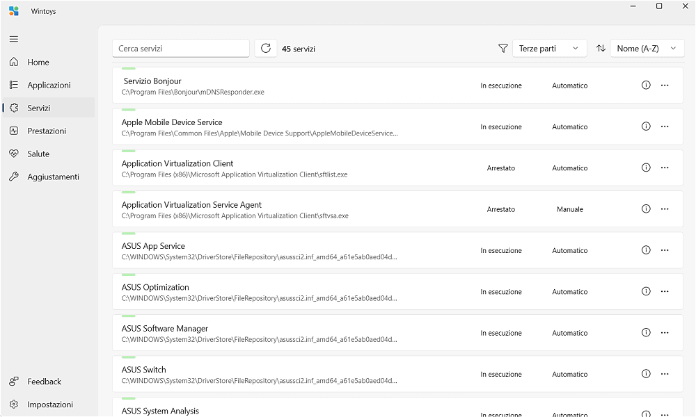 Il nostro consiglio è quello di selezionare Terze parti dal menu a tendina in alto e valutare la disinstallazione delle applicazioni superflue da cui i servizi dipendono.