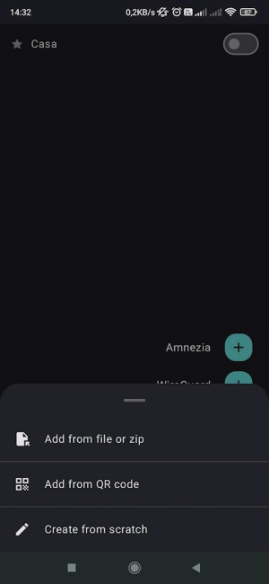 Il modo più semplice per importare la configurazione WireGuard sul ciascun client è avvalersi del codice QR. Nel caso di WG Tunnel, basta toccare l’icona Tunnels in basso a sinistra nell’interfaccia dell’applicazione, scegliere “+” quindi la voce WireGuard e infine Add from QR code.