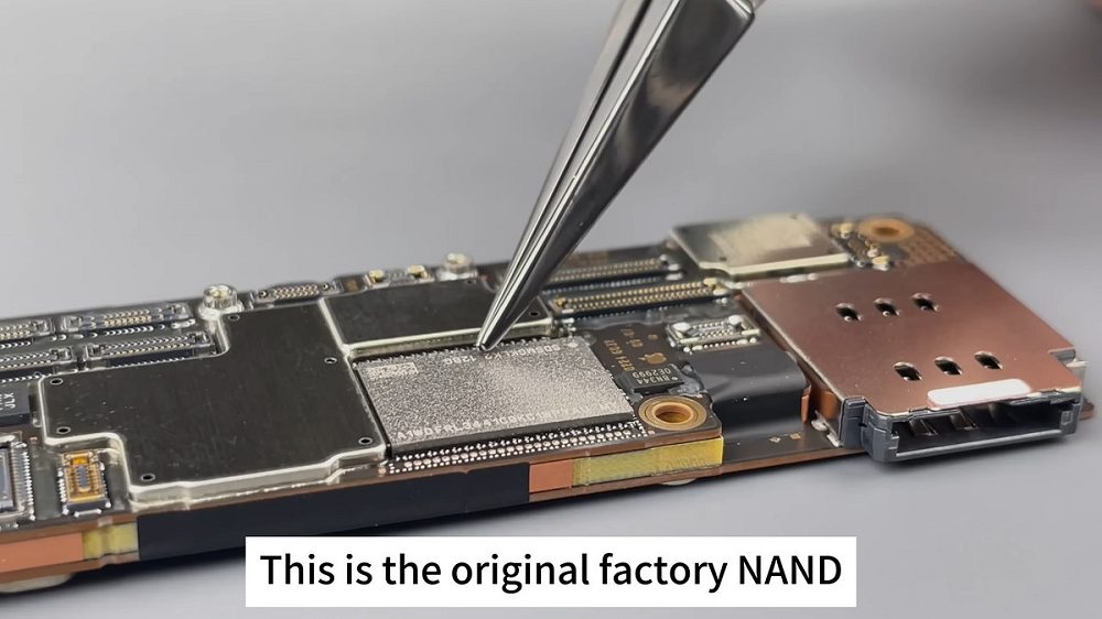 La parte più critica dell’intero processo consiste, ovviamente, nella sostituzione della memoria NAND, originariamente da 128 GB. L’autore del video mostra l’uso di un trapano CNC per rimuovere la memoria NAND preinstallata negli stabilimenti della Mela. In seguito, la polvere ingeneratasi a seguito dell’intervento e la precedente saldatura della memoria NAND sono accuratamente rimosse per fare spazio al nuovo chip NAND da 512 GB.