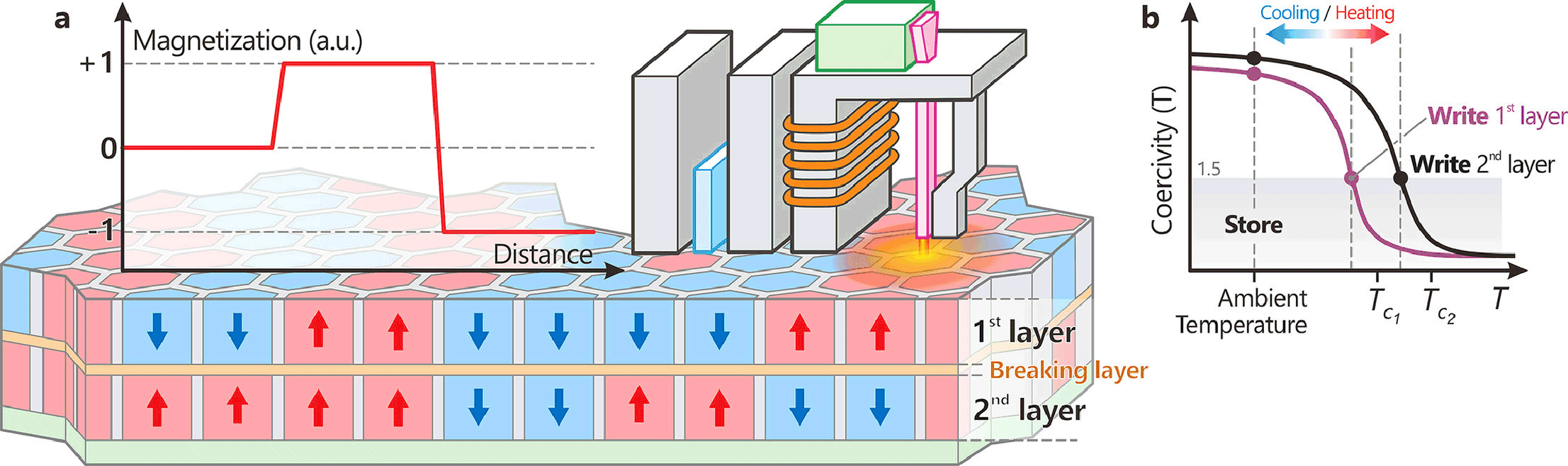 Regolando la potenza del laser e i campi magnetici durante il processo di scrittura, i due strati FePT possono essere registrati indipendentemente. Il traguardo vincente può essere raddoppiando la densità areale e la capacità HDD senza apportare modifiche significative nei materiali del livello magnetico.