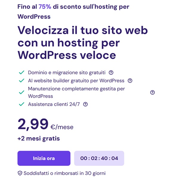 In questi giorni l’hosting WordPress di Hostinger è in offerta da 2,99 euro al mese, con due mesi extra in regalo. L’offerta include inoltre un dominio gratuito e la garanzia Soddisfatti o rimborsati della durata di 30 giorni. E per chi ha già un sito, la migrazione dal vecchio hosting a quello nuovo è a costo zero.