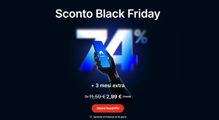Ci siamo: chi sta valutando l’acquisto di una VPN, può fare la sua mossa. Gli sconti del Black Friday infatti sono arrivati anche su NordVPN, che ha lanciato in offerta tutti i suoi piani biennali del 74% con 3 mesi extra gratis.