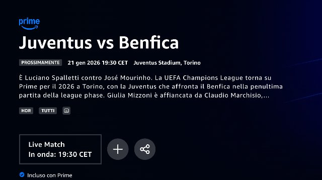 Juventus-Benfica è la partita della settimana di Champions League che sarà trasmessa in esclusiva su Prime Video. Valida per la settima giornata della Phase League, mette di fronte la squadra di Luciano Spalletti con il “nemico” Mourinho: i bianconeri con una vittoria si assicurerebbero in pratica il passaggio almeno ai play-off assaporando, almeno matematicamente, la possibilità di chiudere addirittura tra le prime 8 dopo un inizio complicato.