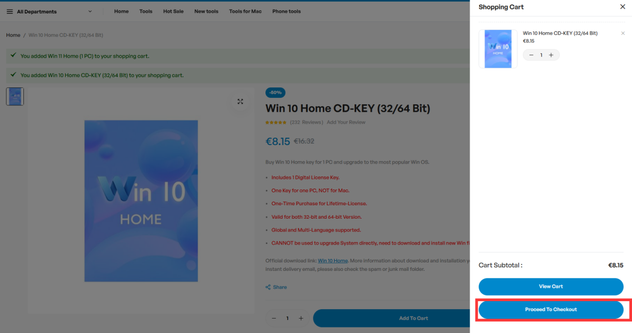 - Aggiungi il prodotto al carrello e clicca su “Procedi al Checkout” dopo la conferma