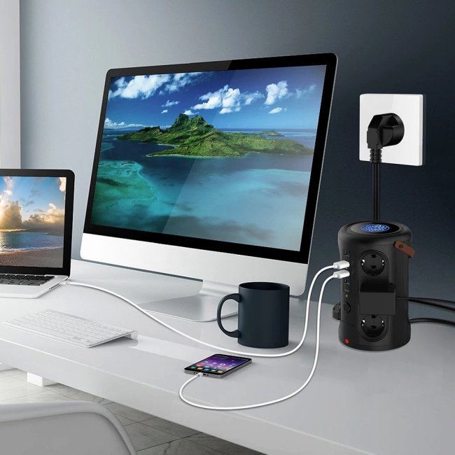 Questa multipresa verticale integra inoltre 4 porte USB per la ricarica e una USB-C. La parte superiore del dispositivo, di forma cilindrica, ospita una base per la ricarica wireless: è possibile adagiarvi gli smartphone compatibili e ricaricarne la batteria senza la necessità di collegare alcun cavo.