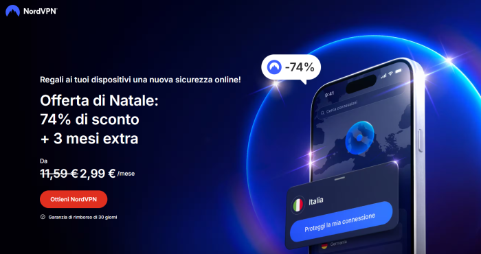 L’offerta NordVPN con sconto del 74%, mesi extra e rimborso garantito è disponibile solo fino al 7 gennaio. Per maggiori info e per l’attivazione basta andare sul sito di NordVPN.