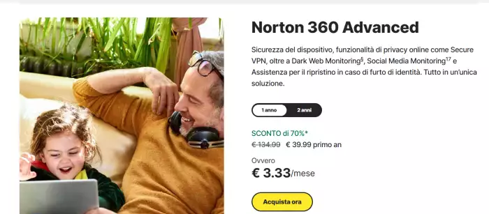 Norton, leader mondiale nella sicurezza informatica, propone un’offerta esclusiva per il suo software Norton 360 Advanced. Per un periodo limitato, è possibile sottoscrivere il piano annuale a soli 3,33€ al mese, con uno sconto del 70% sul prezzo originario. Questa è l’occasione perfetta per ottenere una protezione completa per i tuoi dispositivi a un costo estremamente vantaggioso.