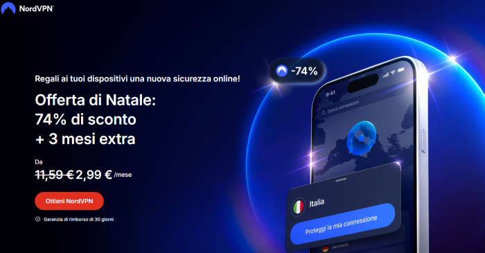 Durante il periodo natalizio, NordVPN lancia una promozione speciale. Per un tempo limitato, è possibile attivare un abbonamento con uno sconto esclusivo fino al 74% e ottenere anche 3 mesi aggiuntivi inclusi.